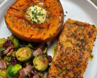Salmon dinner plate with honey balsamic Brussels sprouts and a sweet potato