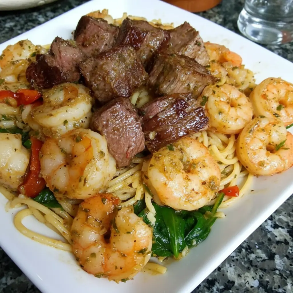 Garlic Butter Steak and Shrimp over Spaghetti is the perfect surf-and-turf pasta dish that feels luxurious yet surprisingly easy to make at home. This recipe brings together tender, juicy steak and buttery shrimp, both cooked in a rich garlic butter sauce that coats every strand of spaghetti. The beauty of this dish lies in its balance—bold, savory flavors from the steak, sweet and delicate shrimp, and a silky sauce that ties everything together without feeling heavy.