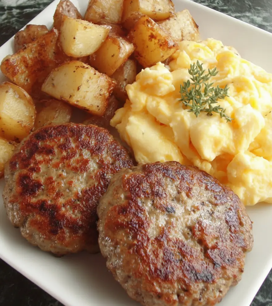 What makes this breakfast special is the balance of flavors and textures. The sausage patties provide rich, savory notes with hints of spices like sage, black pepper, and garlic. When cooked properly, they get that beautiful caramelized crust that locks in flavor. The scrambled eggs bring softness and creaminess, offering a gentle, buttery contrast to the sausage. Cooking eggs low and slow ensures they stay tender and velvety instead of dry. The potatoes round out the plate with their rustic comfort—they’re crispy on the outside, soft inside, and soak up seasoning beautifully. A little paprika, garlic powder, and onion powder can turn simple potatoes into something truly memorable.