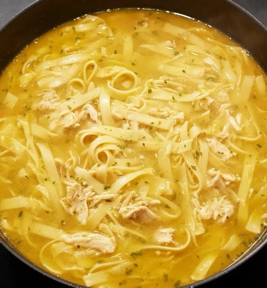 The chicken slowly releases its natural juices into the broth, creating a clean yet savory base that tastes like it’s been cooking all day. Carrots, celery, and onions add sweetness and balance, while garlic and herbs give the soup its familiar, cozy aroma. Egg noodles are added at the end so they stay tender but not mushy, soaking up just enough broth to become flavorful on their own. This soup is especially loved because it’s versatile and forgiving you can make it with a whole chicken, bone-in thighs, or leftover roasted chicken, and it always turns out comforting.