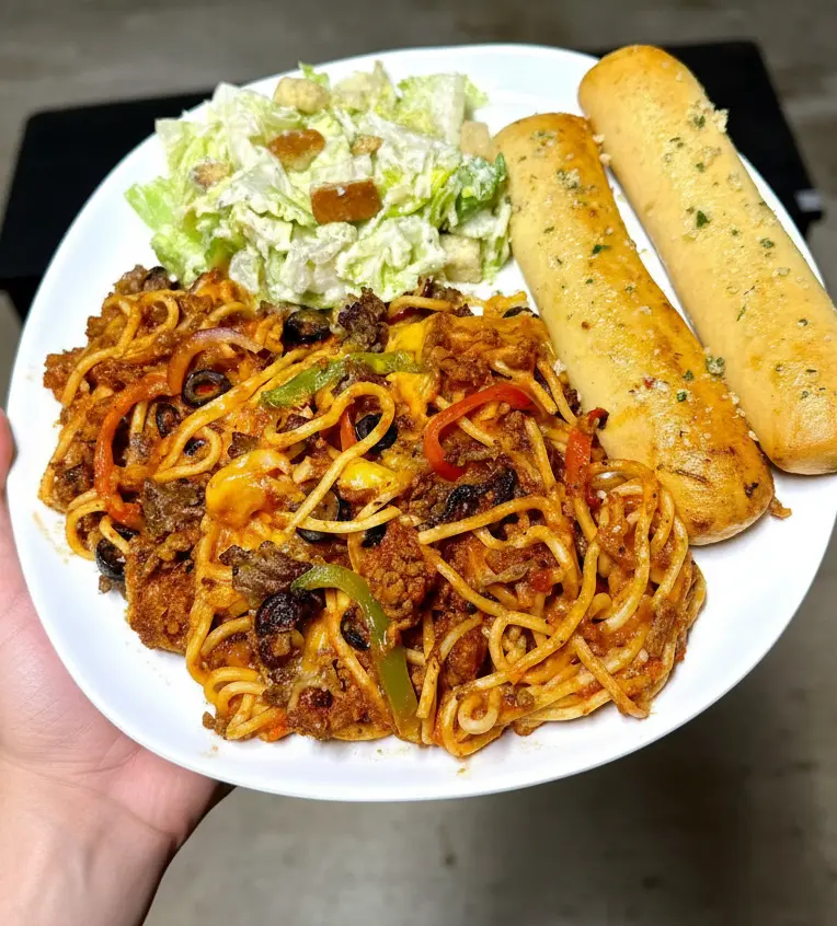 The spaghetti is rich and hearty, layered with seasoned ground beef, savory marinara, and plenty of melted cheese that makes every forkful satisfying and indulgent.