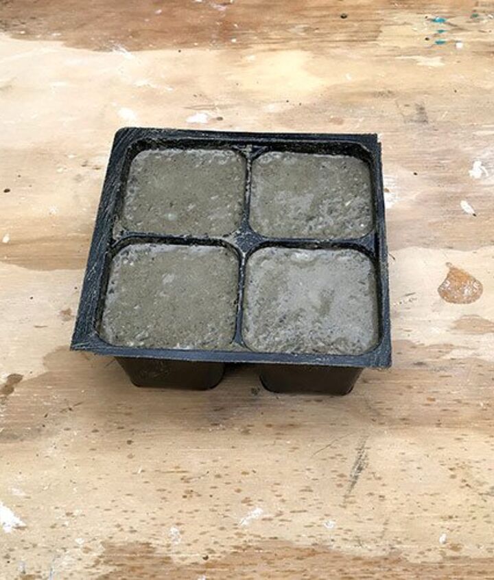 Spray the vegetable oil into the planter mould and pour in the concrete. Wait about 10-15 minutes, then push the head of a screw into each container with concrete so that they are about an inch in.