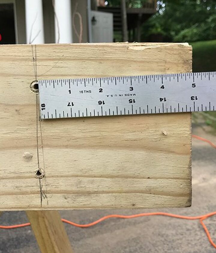 Next, to mark the center of each foot, measure in at 1 ¼” from each side. Then drill a pilot hole that fits the width of the screws in the concrete feet. You’ll want to make sure you will be able to screw in your legs without hitting the one next to it, but these will be attached in Step 6.