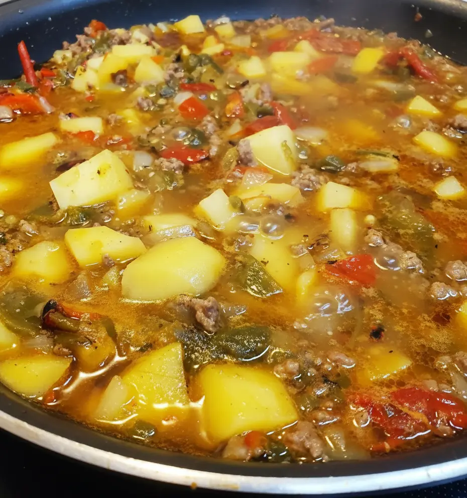 The stew in the photo highlights exactly what makes this dish special. The potatoes soak up the flavors of the broth, becoming creamy and tender while still holding their shape. Bell peppers and tomatoes add color and brightness, and the bits of ground beef enrich the stew with savory depth. Some versions use pork, beef chunks, or even chicken, but the essence remains the same: the magical flavor of green chiles anchoring the entire dish. Whether mild, medium, or hot, green chiles define this stew and create a warming, irresistible bowl of comfort that people return to again and again.