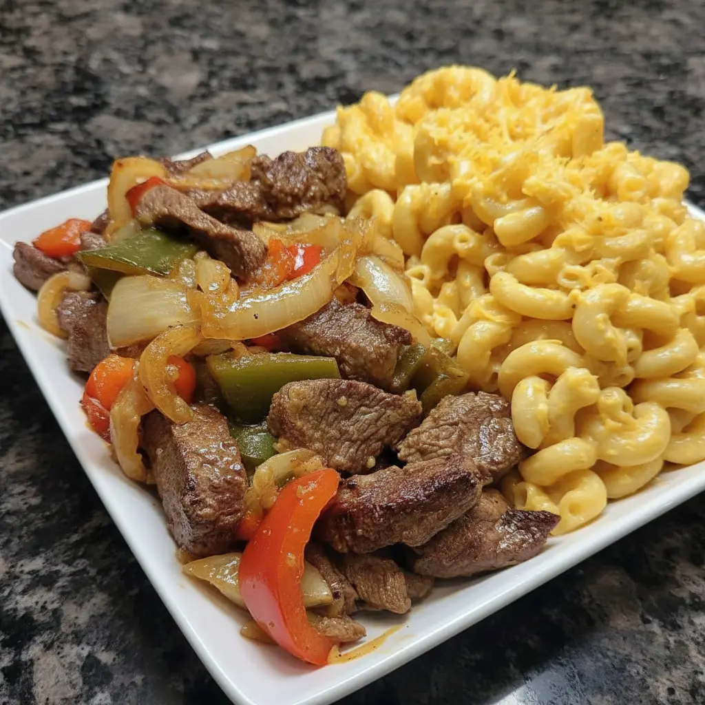 Pepper steak with macaroni and cheese is the kind of comforting, satisfying meal that brings together bold savory flavors and creamy richness in one irresistible plate. The pepper steak is tender, juicy, and full of flavor from the sautéed onions and bell peppers that cook down into a slightly sweet, slightly smoky mixture. Every bite carries that familiar stir-fry-style warmth combined with the hearty chew of beef. The vegetables soften and caramelize just enough to enhance the beef without overpowering it, giving you that classic pepper steak taste that always hits the spot.
