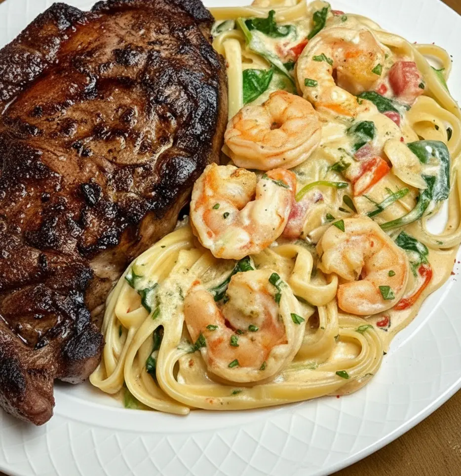 The key to this dish is cooking each component properly. A ribeye should be seared over high heat to develop a caramelized crust while keeping the inside tender and juicy. Letting it rest before slicing ensures every bite stays flavorful. The shrimp pasta works best with a garlic cream or light butter sauce that complements, rather than competes with, the steak. When plated, slice the ribeye and fan it slightly beside a nest of creamy shrimp pasta for a polished presentation.