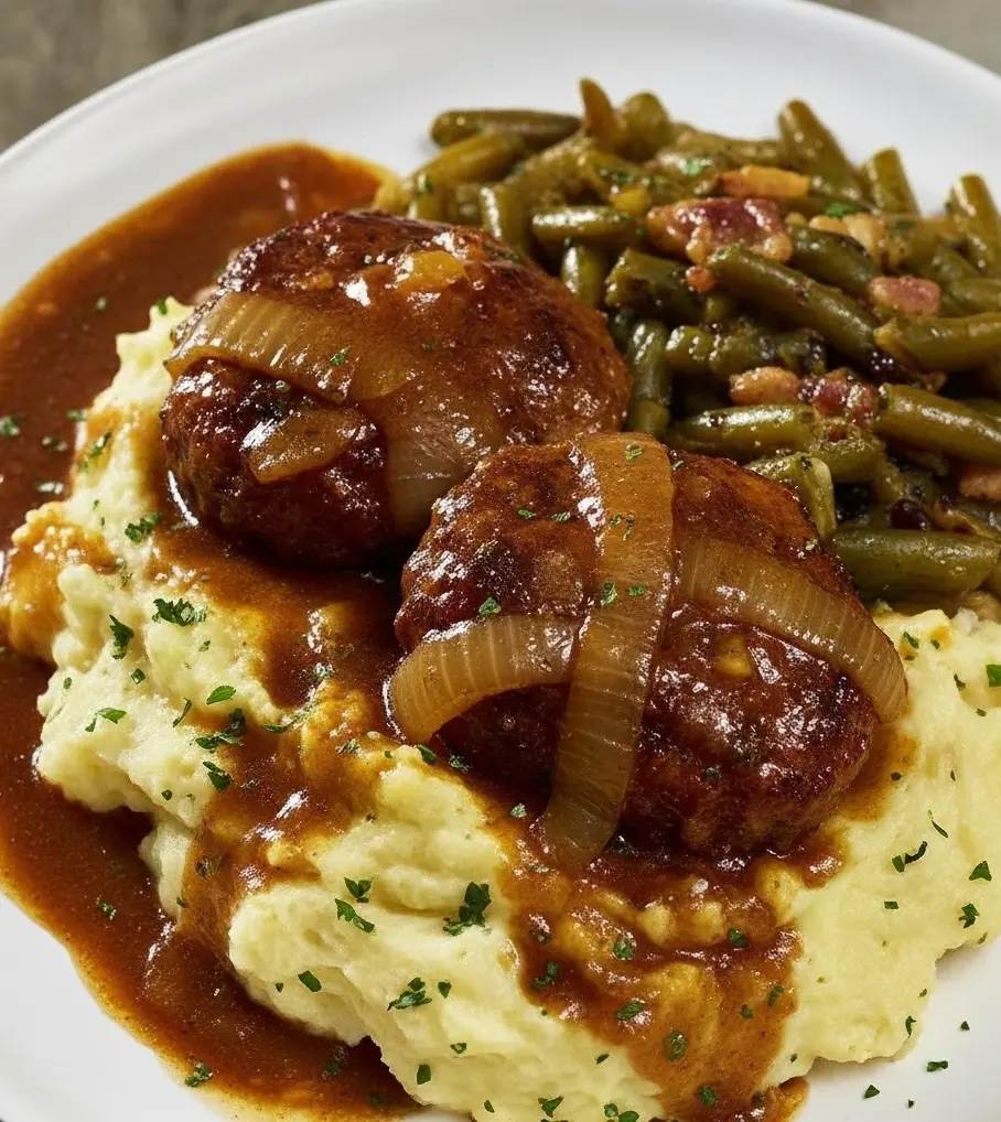 Salisbury Steak with Green Beans and Mashed Potatoes is the ultimate comfort plate, bringing together tender, juicy beef patties smothered in rich onion gravy, creamy buttery mashed potatoes, and simple seasoned green beans. This classic homestyle dinner has been a family favorite for generations because it’s hearty, satisfying, and built around simple ingredients that deliver big flavor.