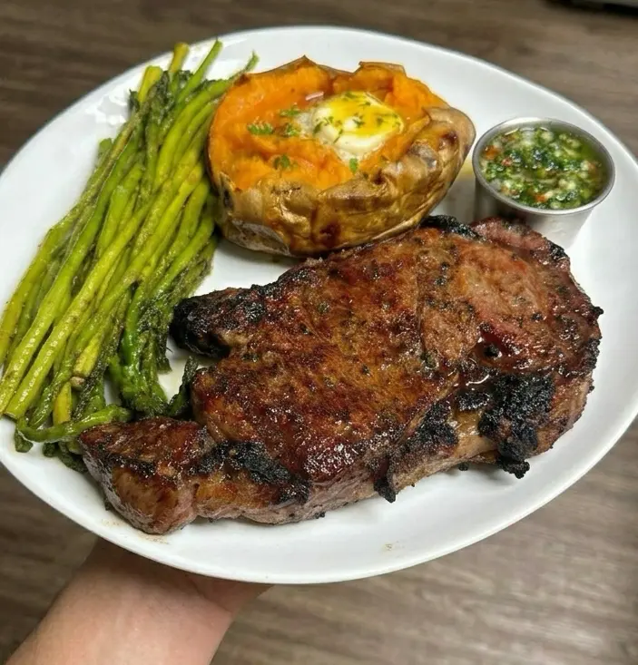 Smoked Ribeye and Sweet Potato Plate with Homemade Chimichurri is a bold, balanced dinner that feels rustic yet elevated. The deep, smoky crust on the ribeye pairs beautifully with the natural sweetness of roasted sweet potatoes, while fresh chimichurri cuts through the richness with brightness and herbaceous punch. This is the kind of plate that looks stunning dark seared steak, vibrant green sauce, and golden sweet potatoes all working together visually and flavor-wise.