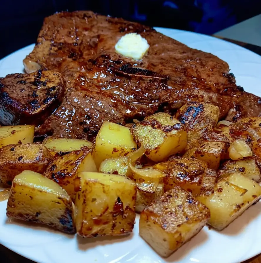 There’s something incredibly satisfying about a perfectly seared steak served alongside golden, crispy home fries with tender sautéed onions. This dish has the comforting feel of a hearty diner classic but the rich, indulgent flavor of a steakhouse meal. The magic begins with choosing a good cut of steak ribeye, sirloin, or T-bone—all of which develop a deep crust when seared in a hot pan or griddle. The butter melts into the surface, mixing with the seasonings and natural juices to create that glossy, savory finish you see in the picture. Every bite has a balance of smoky char, juicy tenderness, and buttery richness.