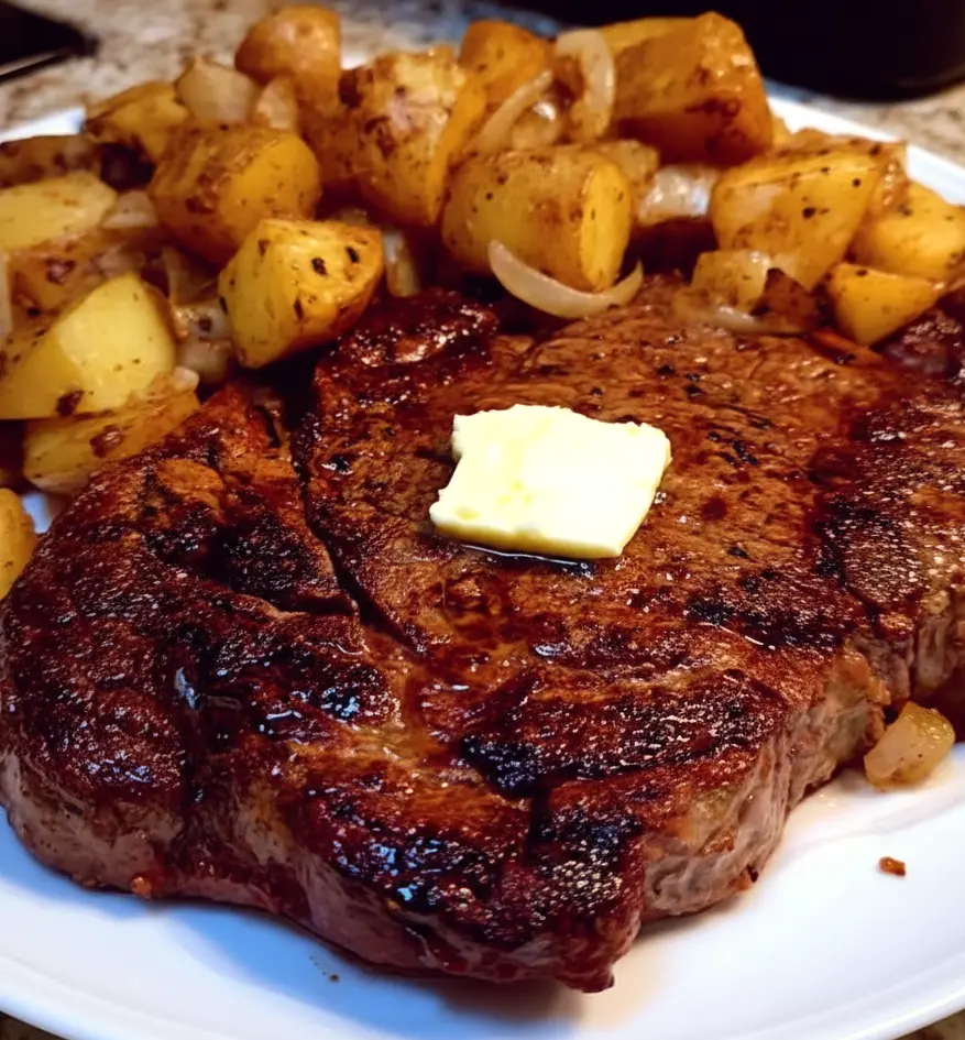 Steak with Herb-Roasted Potatoes is the definition of a hearty, comforting, restaurant-quality meal made right at home. The picture you shared shows everything people love about this classic dinner: a beautifully seared steak with a buttery finish, paired with golden roasted potatoes and sautéed onions that soak up every bit of herb and seasoning. The contrast between the rich, juicy steak and the crispy, flavorful potatoes creates a satisfying and balanced plate. This kind of dish is perfect for weeknights when you want something filling and comforting, but it’s also impressive enough for date nights, celebrations, or a special Sunday meal.